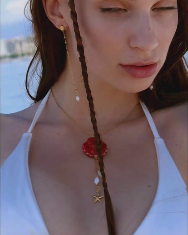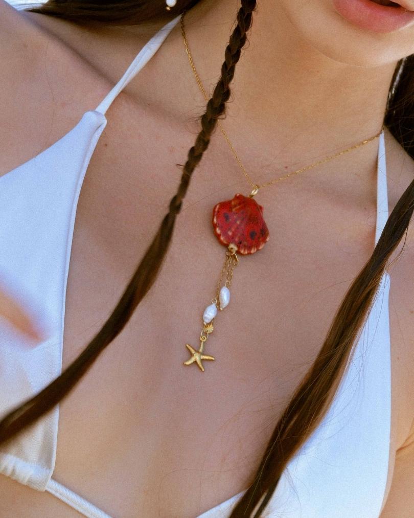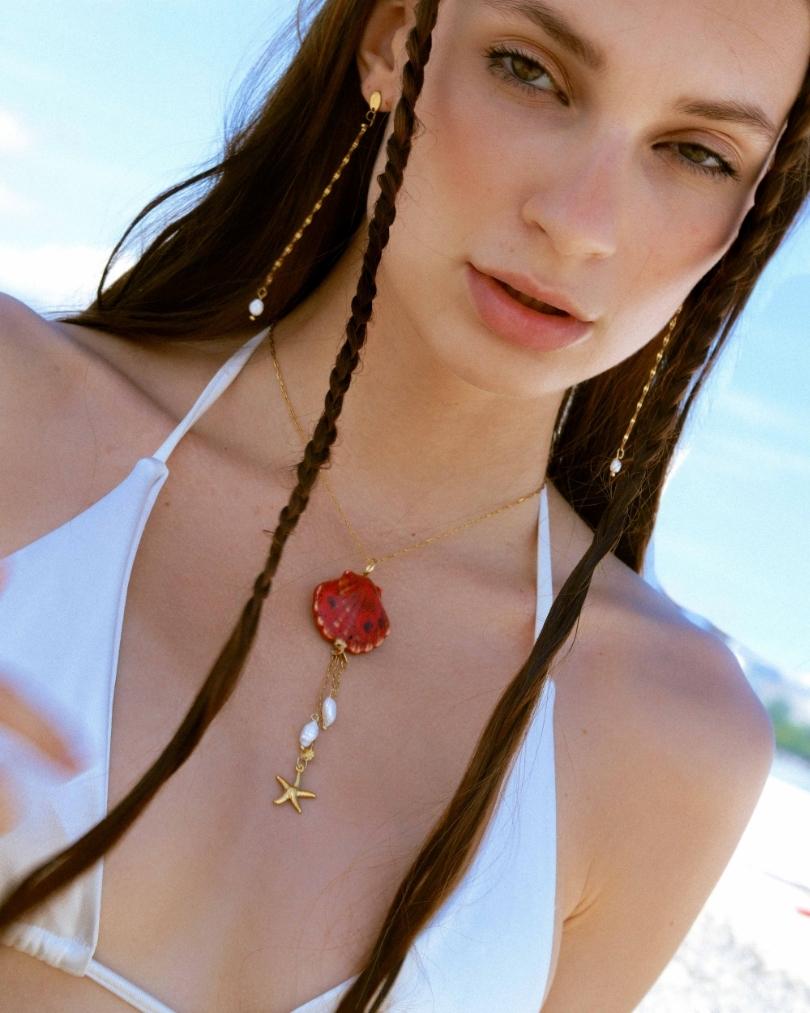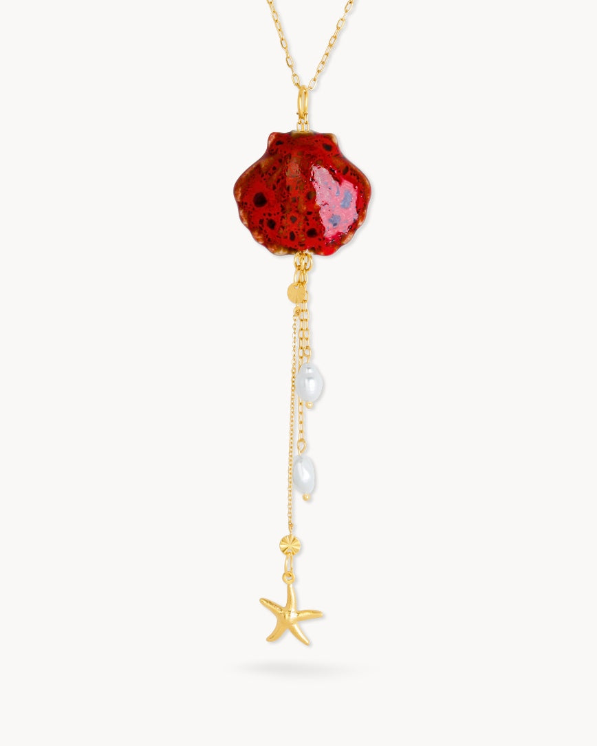 Handcrafted with hand-painted ceramic shell and natural pearls, this piece reminds us of the sea breeze. This jewel uses natural stones that capture the essence of the ocean, evoking our roots and the shared history with the deep waters.